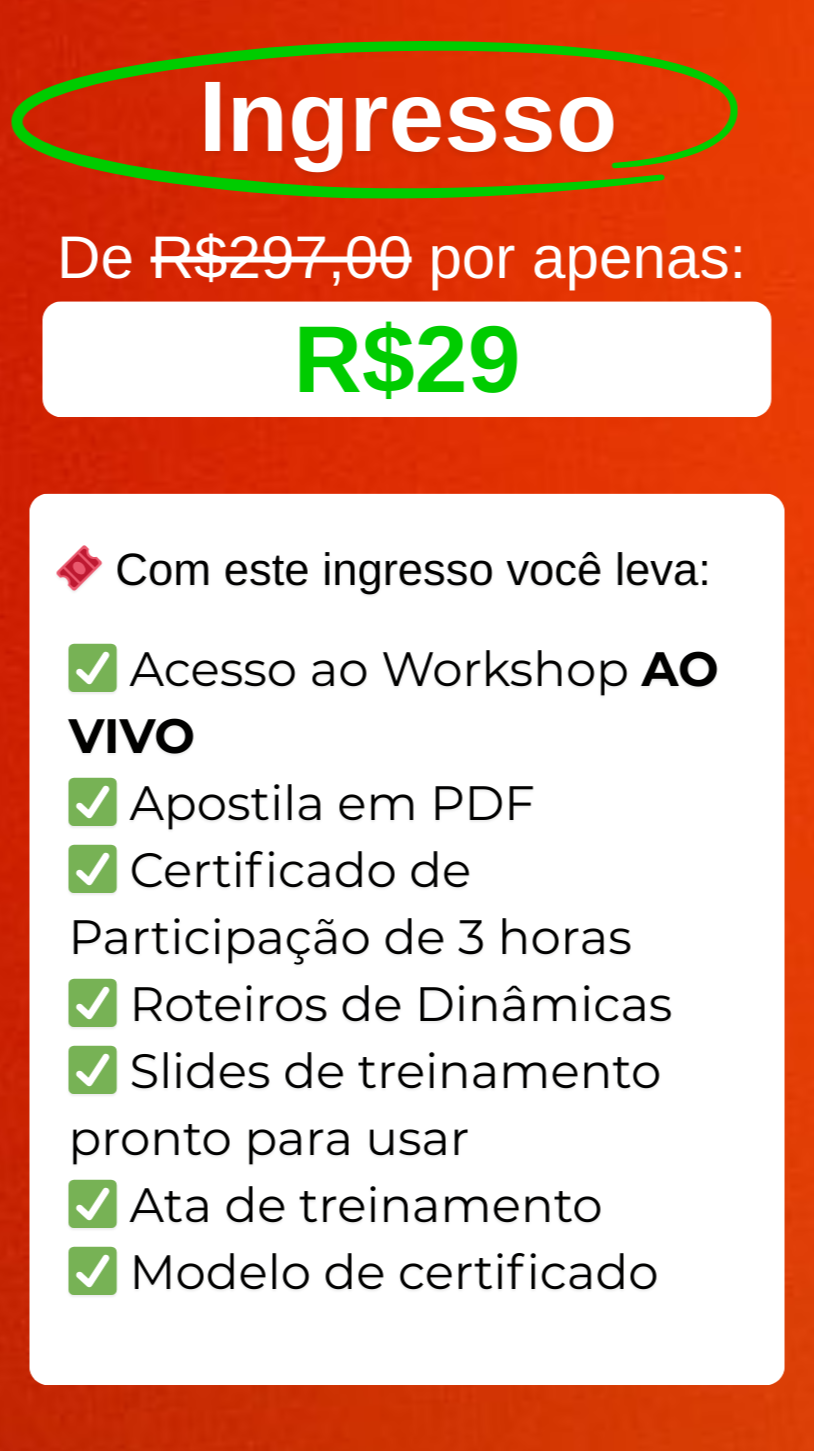 Perdeu alguma parte ou quer assistir de novo com calma? Com esse replay, você tem 1 ano para rever todo o conteúdo e reforçar tudo o que aprendeu, no seu ritmo, quantas vezes quiser. Incluindo: ✅ Slides de treinamento pronto para você aplicar ✅ Roteiros de dinâmicas ✅ Ata de Treinamento ✅ Modelo de Certificado para seus treinamentos.