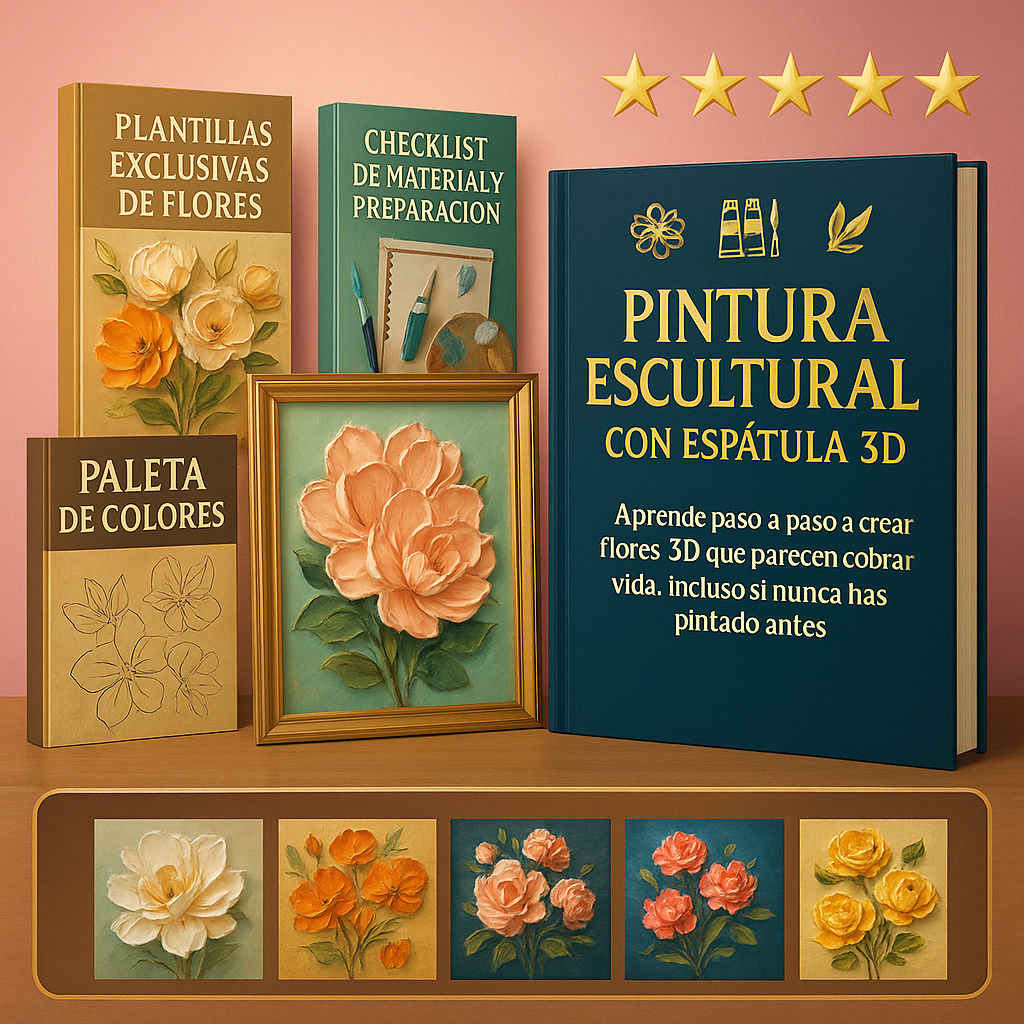 Estás a punto de adquirir el guía principal, y justo ahora tienes la oportunidad de llevar también TODOS los productos adicionales con un descuento especial por tiempo limitado. 💥 ¿Qué incluye este paquete exclusivo? GUÍA COMPLETA EFECTO ORO EN ARTE EN RELIEVE; GUÍA PARA VENDER ARTE ESCULTÓRICO 3D; PACK DE IMÁGENES E INSPIRACIÓN; RECETAS CASERAS PARA PASTAS DE MODELADO 3D; 🎨 MINI GUÍA DE ESPÁTULAS Y PINCELES ✨ Más del 90% de nuestras alumnas eligen esta opción porque realmente vale la pena.