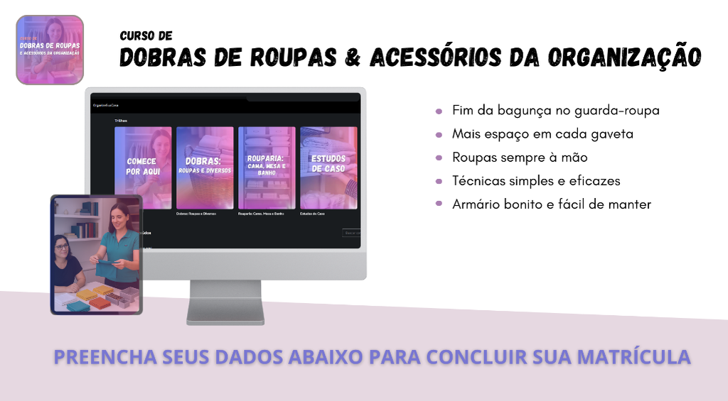 Acelere sua organização com o eBook Chega de Bagunça! Em apenas 15 minutos por dia, você vai quebrar o ciclo da bagunça, criar uma rotina prática e ter resultados visíveis já nos primeiros dias. É o complemento perfeito. 8 em cada 10 alunos decidem levar ele também! (e-book)
