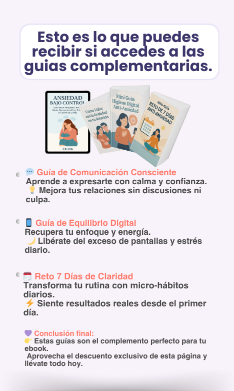 La ansiedad no tiene por qué ser un obstáculo en tu relación. Con esta guía aprenderás a convertirla en una oportunidad para unirse más y comunicarse mejor. Dentro encontrarás: ✅ Estrategias simples para romper el ciclo de discusiones y distancias. ✅ El método “Pausa – Valida – Acuerda” para hablar sin herirse. ✅ Claves para establecer límites sanos y apoyar sin cargar con todo. ✅ Ejemplos prácticos que podrás aplicar desde el primer día.