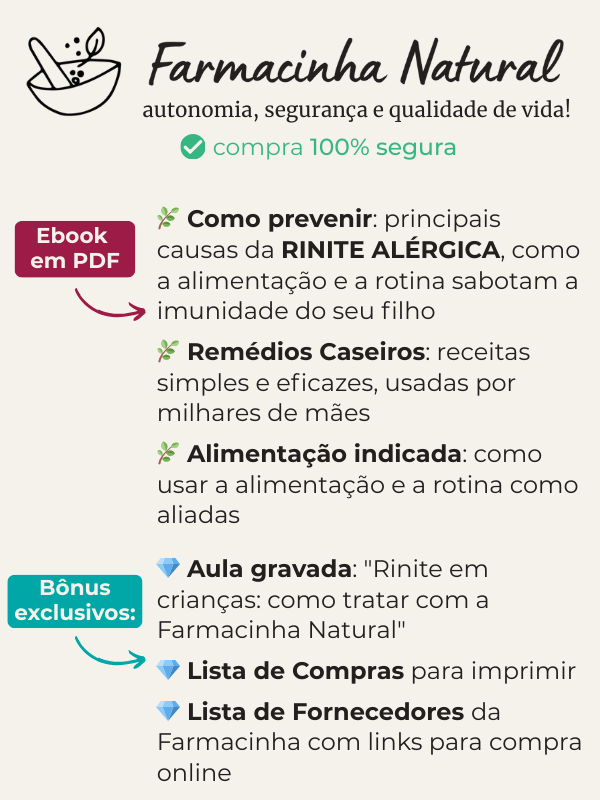 Um eBook completo com receitas fáceis, usando ingredientes que você já tem em casa. Tudo explicado passo a passo, para que você saiba o que fazer assim que os primeiros sintomas aparecerem, mesmo que nunca tenha usado remédios caseiros antes. Bônus especiais: 💎 Aula gravada: "Como usar a Farmacinha Natural para bebês e crianças pequenas" 💎 Lista de Compras para imprimir 💎 Lista de Fornecedores da Farmacinha com links para compra online - Ao sair desta página a oferta expira -