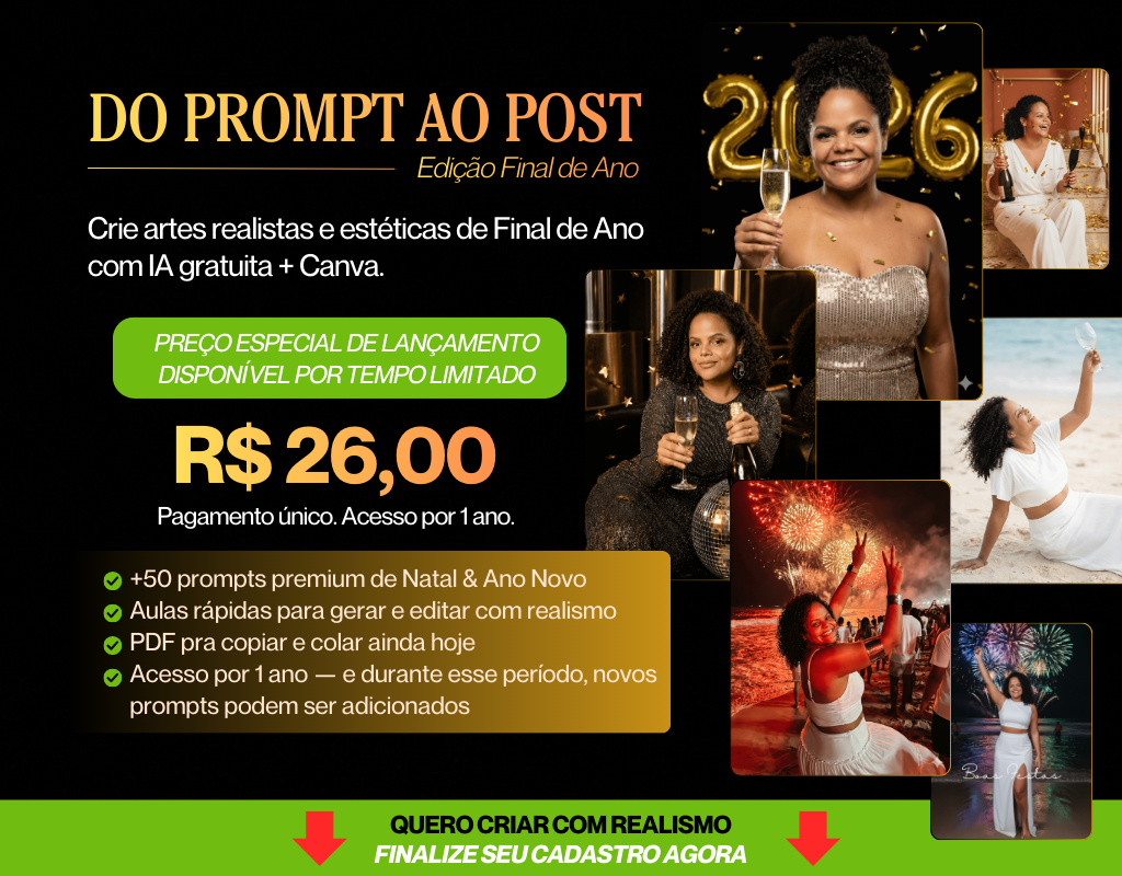 Desbloqueie mais de 50 prompts premium para criar imagens REALISTAS de pessoas, produtos, ambientes e texturas.