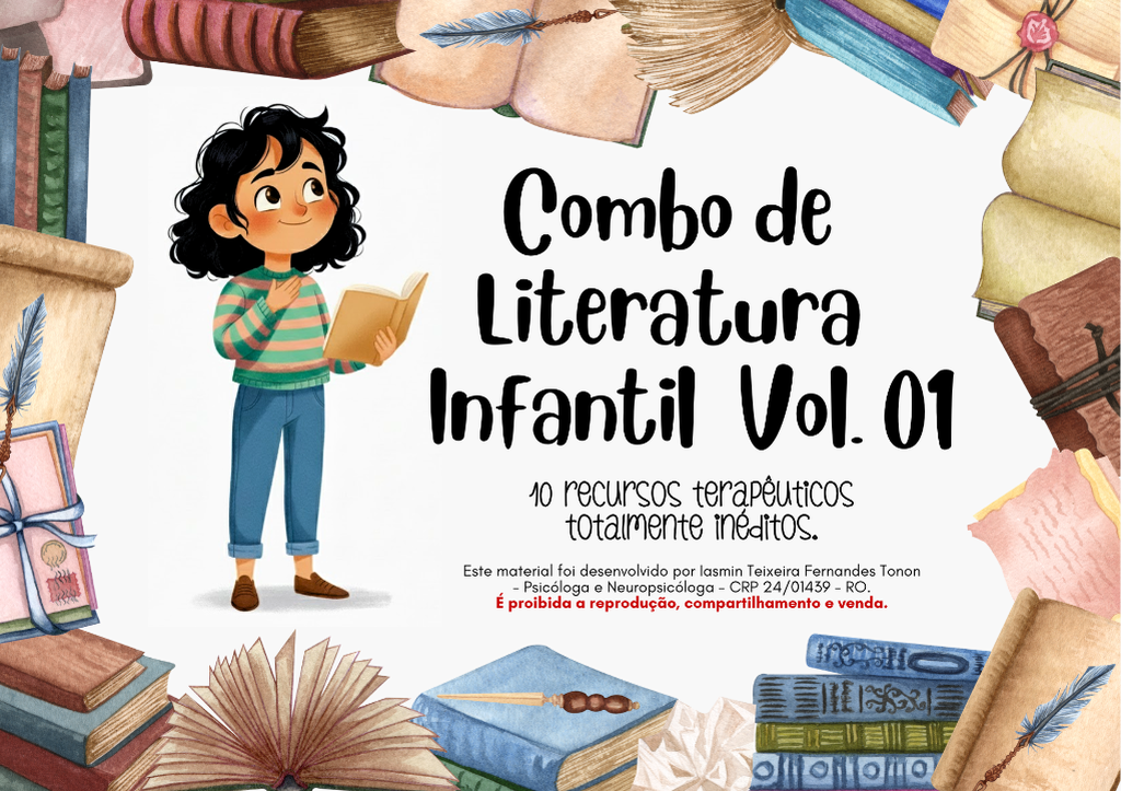 O Combo de Literatura Infantil reúne 10 recursos terapêuticos completos, cuidadosamente elaborados a partir de livros infantis selecionados entre os melhores para uso clínico, escolar e familiar. Cada material foi pensado para ajudar crianças a explorar sentimentos, enfrentar desafios, fazer escolhas e desenvolver habilidades socioemocionais de forma lúdica e envolvente.