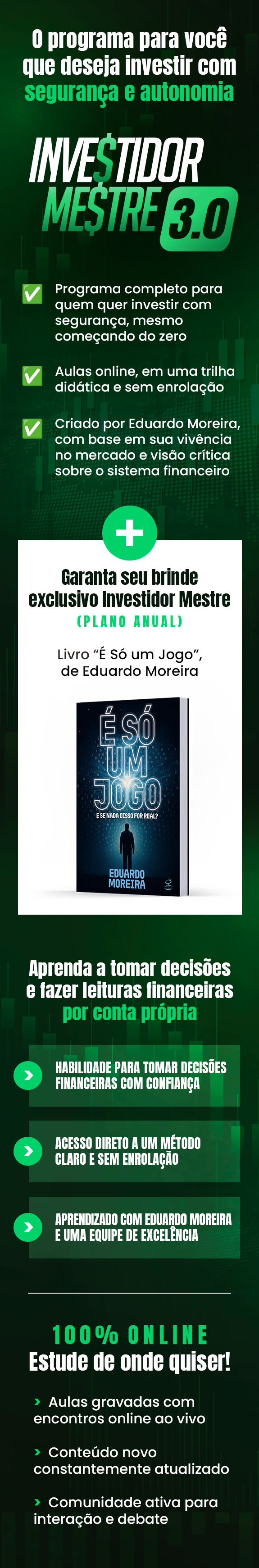 As lições mais importantes de Eduardo Moreira sobre Mentalidade para Investir e Como Construir Riqueza. Aprenda a blindar sua mente para investir com segurança e assertividade. Apenas nesta oportunidade, você garante super desconto + acesso vitalício. Além disso, você possui 15 dias de garantia para solicitar reembolso, por qualquer motivo.