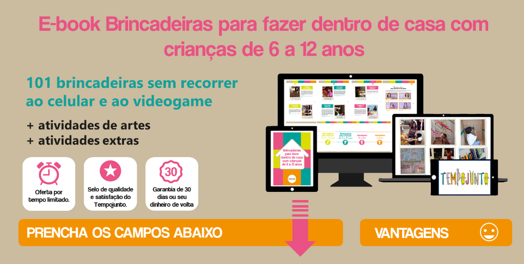 Pensando nisso, criamos este e-book com dicas de brincadeiras para fazer dentro de casa com as crianças de 6 a 12 anos. Espero que você goste das nossas dicas!