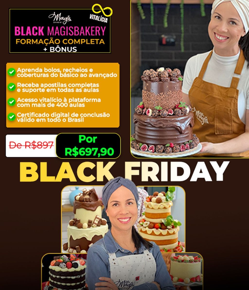 🎉 Oferta exclusiva da Black MagisBakery Vitalícia! Garanta acesso vitalício a todos os cursos da Gislaine Diniz 👩🏻🍳 Mais de 400 aulas e conteúdos inéditos para transformar sua confeitaria e faturar todos os dias. Promoçã