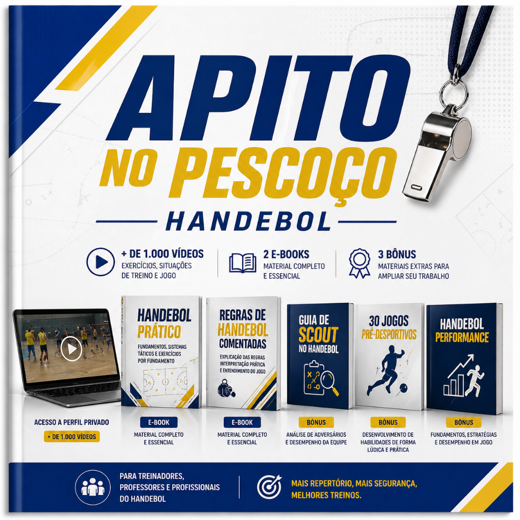 O Handebol Prático organiza fundamentos, sistemas táticos e exercícios por fundamento, ajudando você a estruturar melhor suas sessões.