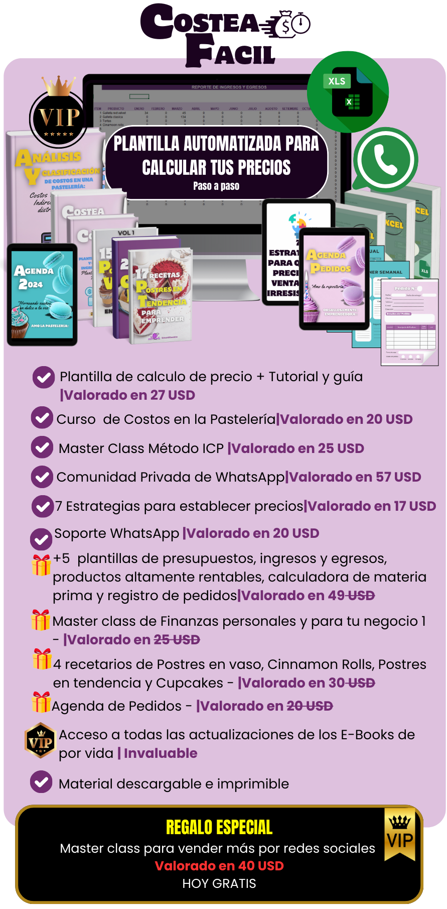 Llévate más de 300 recetas de galletas, rellenos, brownies, helados, y más por un precio de única oportunidad. -150 recetas de galletas New York. -Ebook de 60 rellenos para tus galletas NY. -25 ideas de decoración y recetas para tus galletas estilo nueva York. -Mi guía secreta para hacer galletas Nueva York -Ebook de estrategias de Marketing Digital parta tu negocio de galletas Estilo Nueva York. - 25 recetas de Brownies. -25 recetas de helados. -25 recetas de Cinnamon Rolls y más