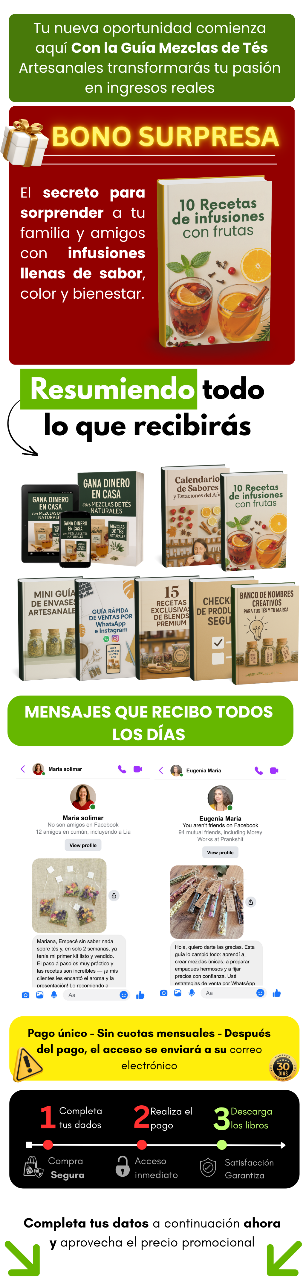 llévale los 2 productos de arriba más 3 productos extras en um solo pack y ahorra casi el 60% del valor real. 👉 Guía Completa de Tés y Blends para Bajar de Peso 👉 Plantas Mágicas y Propiedades Espirituales del Té 👉 Guía Completa para Deshidratar Frutas en Casa 👉 Guía Proveedores Internacionales de Té a Granel 👉 Minicurso de sumiller de té ⚠️Paqueta 5 en 1 - todos os productos arriba en solo oferta - disponible solo en esta página.