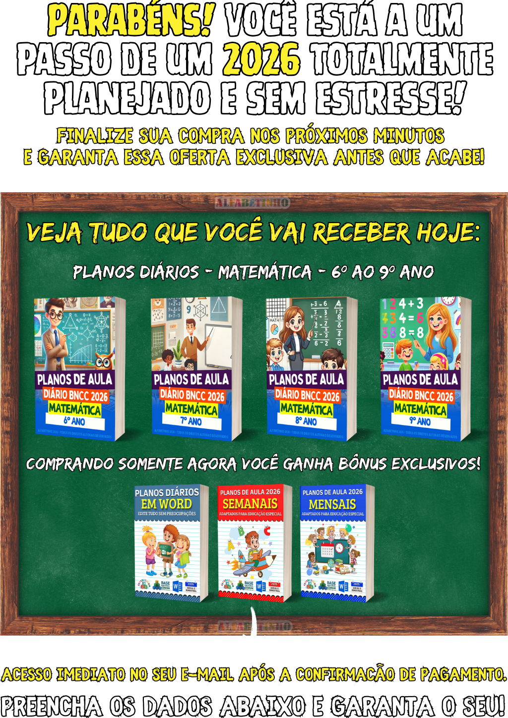 512 Atividades e 480 Planejamentos, todos organizados por Ano e Bimestre, de acordo com a BNCC 2026. perfeitas para uso imediato. 🎁 GANHE BÔNUS EXCLUSIVOS: 1️⃣ PLANEJAMENTOS EM WORD 2️⃣ ATIVIDADES EM WORD 3️⃣ GABARITOS DAS ATIVIDADES 4️⃣ 32 PLANOS DIÁRIOS 5️⃣ 24 PLANOS SEMANAIS 6️⃣ 16 PLANOS MENSAIS 😱 DESCONTO IMPERDÍVEL, APENAS AGORA!