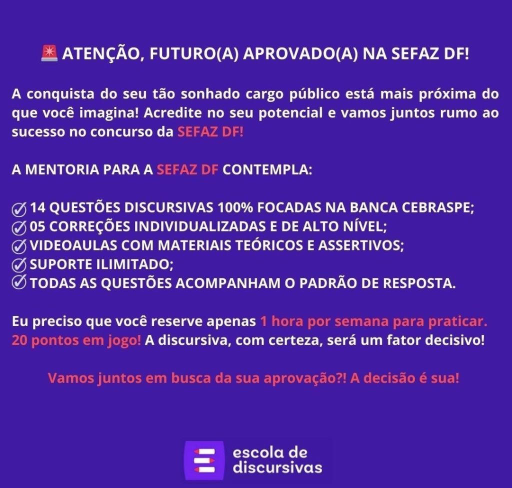 SEFAZ DF: +2 CORREÇÕES AVULSAS - CONTEMPLA: ✅ + 02 CORREÇÕES INDIVIDUALIZADAS (EM ÁUDIO, GRIFOS E MARCAÇÕES). ✅ TODAS AS QUESTÕES ACOMPANHAM O PADRÃO DE RESPOSTA ESPERADO, DISPONIBILIZADO APÓS 7 DIAS. É uma preparação objetiva e de alto nível! Eu preciso que você reserve apenas 1 hora por semana para praticar. Assim, você chegará no dia da prova com confiança na discursiva. Vamos juntos em busca da sua aprovação?! A decisão é sua!