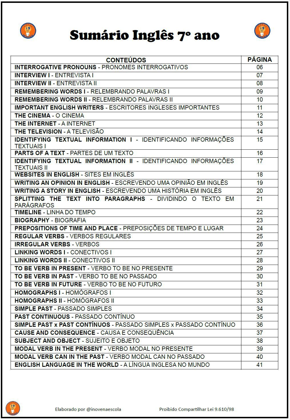 Bingo de Conteúdos Inglês 6º ano