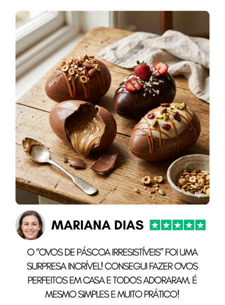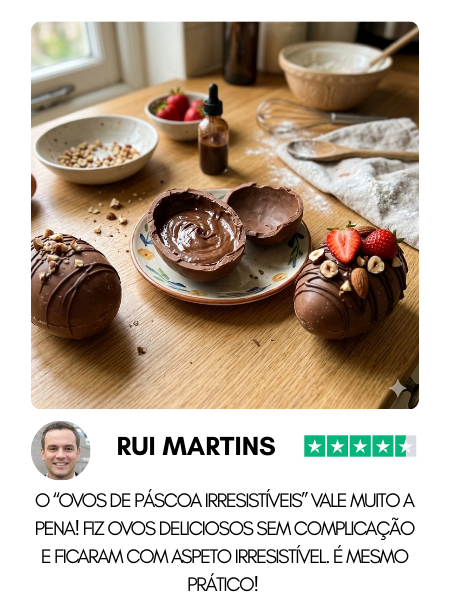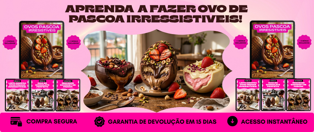 🛡️ Adicionar Garantia de Resultado na Primeira Tentativa 🛡️ Se seguires o método e mesmo assim não conseguires fazer ovos de Páscoa com bom resultado, devolvemos o teu dinheiro. Compra 100% sem risco.