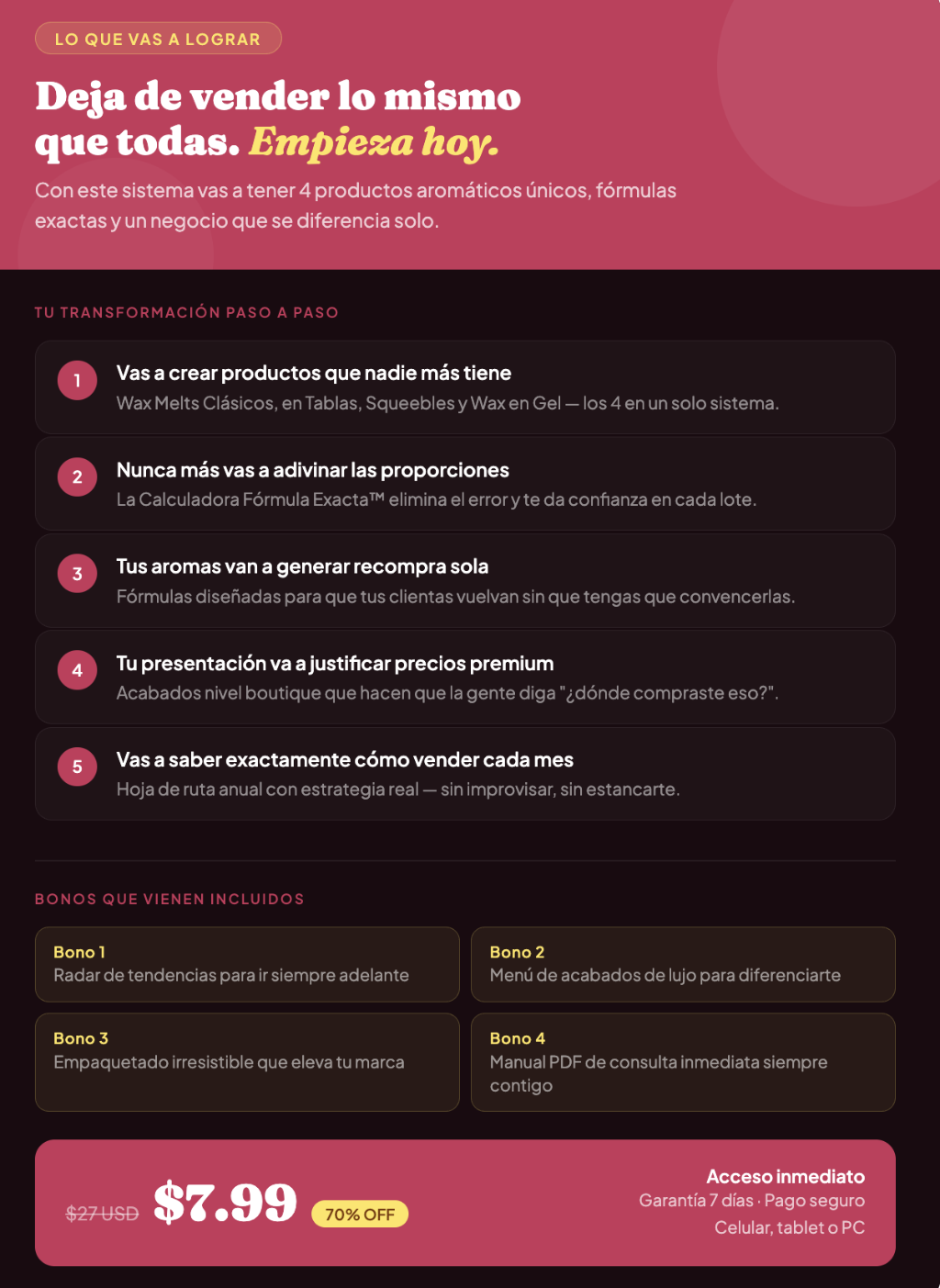 ✦ Agrega esto y además de saber hacer tu producto, sabrás exactamente qué hacer con él: qué precio ponerle sin quedarte corta, cómo presentarlo para que la gente quiera comprarlo, cómo organizarte cuando los pedidos llegan y cómo conseguir que esas mismas clientas te vuelvan a buscar. Hacer un producto hermoso que huele increíble es la parte bonita — este curso se encarga de todo lo que viene después.