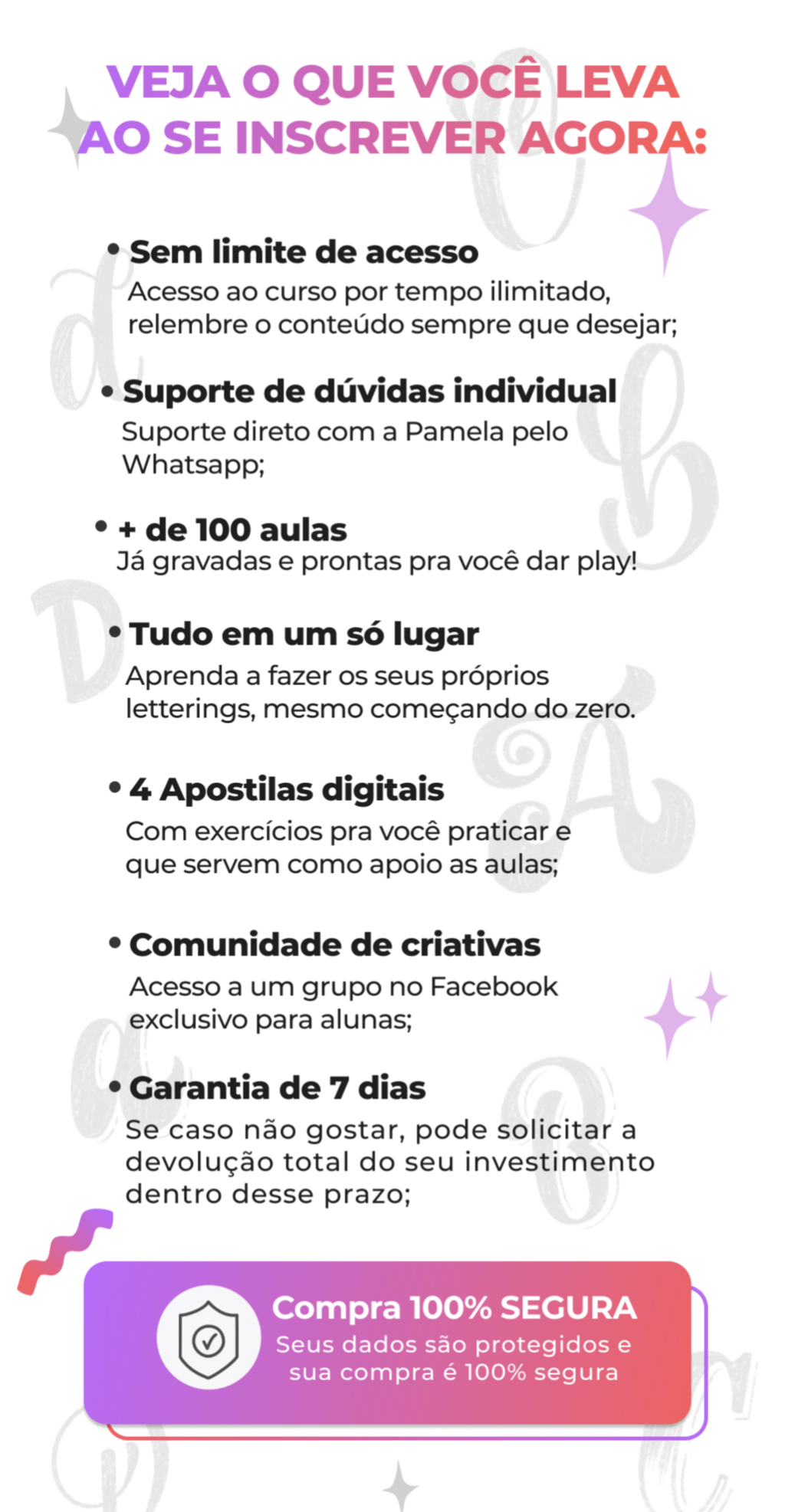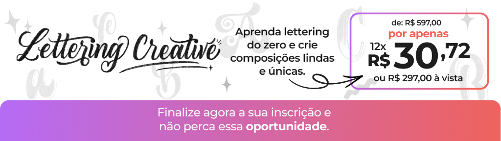 Aproveite e leve junto com um PREÇO SUPER ESPECIAL o Curso de Composições Avançadas com ele você vai ir além e elevar ainda mais as suas habilidades de composições. O foco dele é te ensinar a criar COMPOSIÇÕES IMPACTANTES, que vão dar um up no seus letterings; ✏️Mais de 20 Aulas; 🌈Acesso vitalício; ✨Apostila exclusiva;