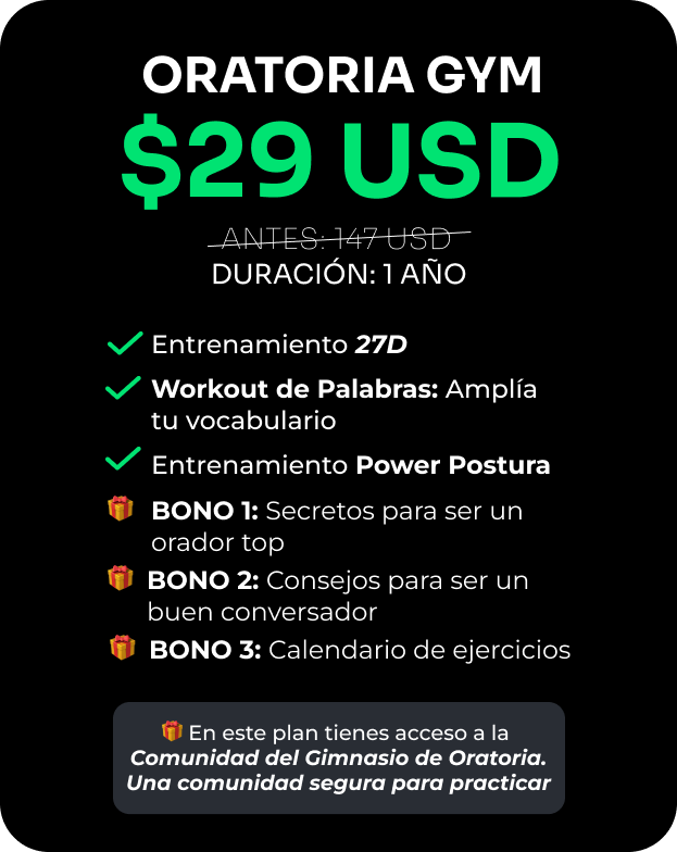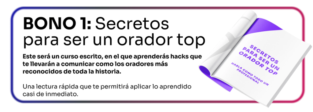 Las muletillas ya no serán un problema. Aprende a erradicarlas para que hables como un profesional. Solo encontrarás este precio aquí. Accede hoy por este valor, y además, accede a 2 bonos sorpresa dentro de este ebook.