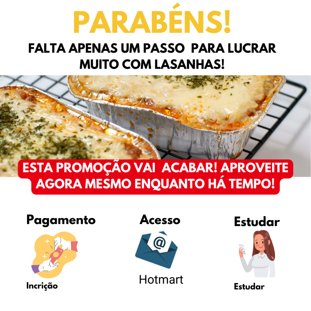 Aproveite para levar junto a planilha prática que te ajuda a calcular o preço ideal das suas lasanhas! Não corra o risco de cobrar errado e sair no prejuízo. Com essa ferramenta, você garante precificação exata, margem de lucro segura e preços estratégicos para vender mais e lucrar de verdade!