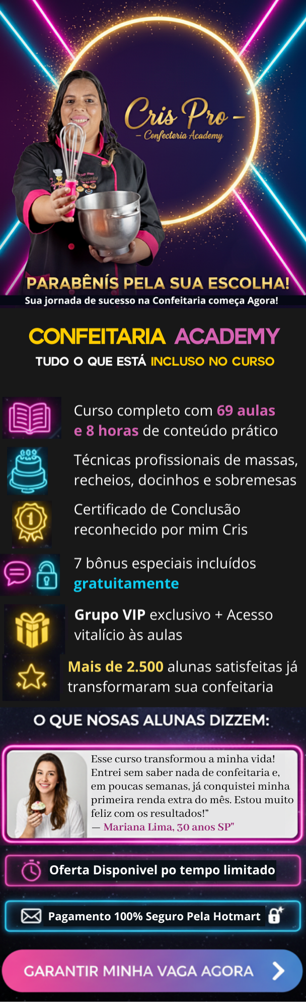 ✨ Transforme seus bolos em verdadeiras obras de arte! ✨ Leve +40 RECEITAS TESTADAS de massas fofinhas, recheios cremosos e coberturas irresistíveis para bolos de vitrine, no pote, tortas e sobremesas. 🍰 RESULTADOS REAIS: 👇 “Em 30 dias minhas vendas aumentaram 40%!” — Maria, 35 anos, SP. 💰 De R$67,99 por apenas R$25,99 — ACESSO IMEDIATO! ⚡ OFERTA EXCLUSIVA disponível somente aqui na compra do Cris Pro Academy!