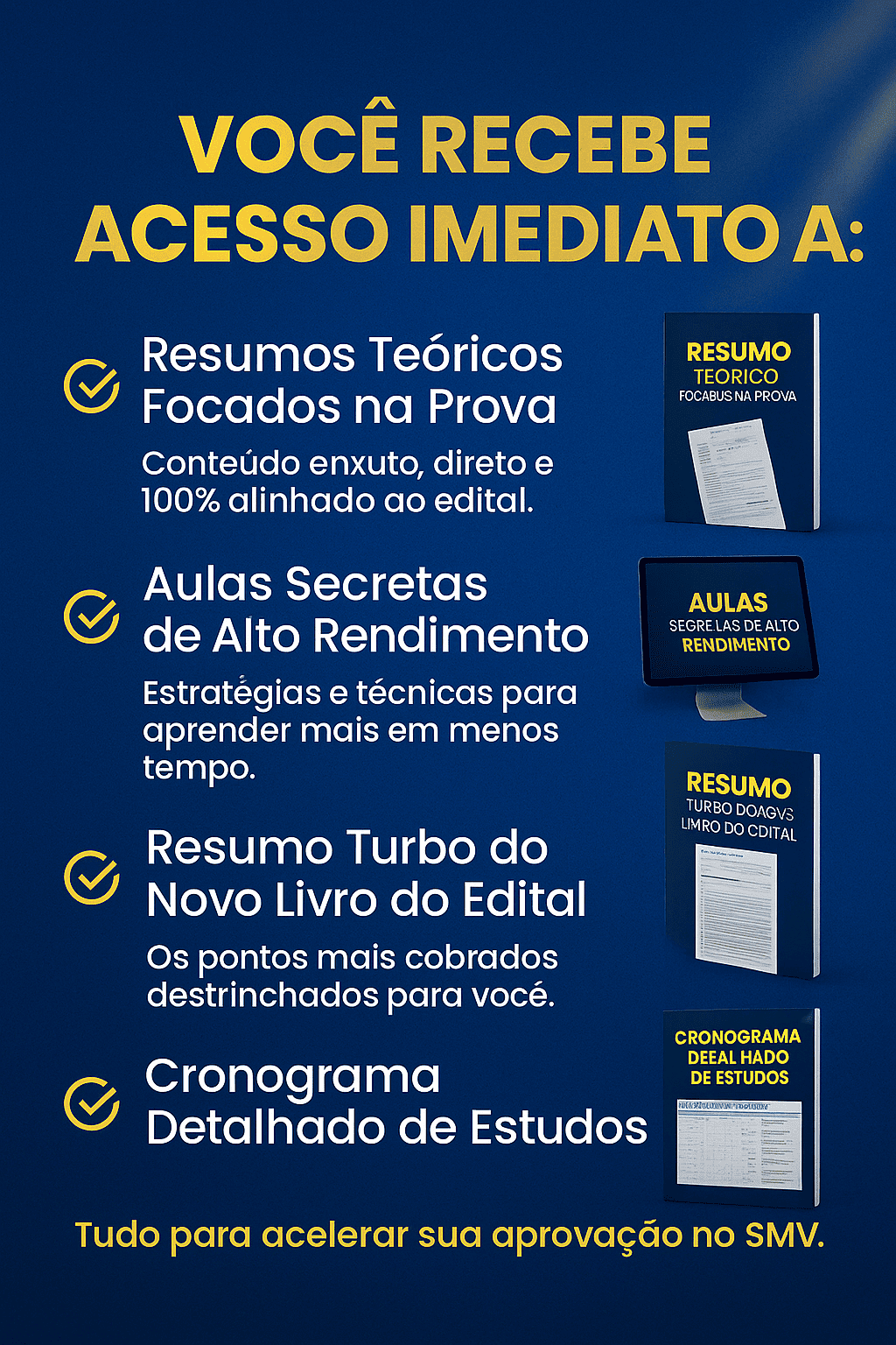 🧠 Quer praticar em alto nível e chegar na prova sem surpresas? O pacote com 1000 questões comentadas é o complemento perfeito para intensificar sua preparação. Você já encontra questões dentro dos resumos, mas aqui você vai ter volume e variação para treinar como quem quer gabaritar. ⚠️ Acesso exclusivo nesta página.