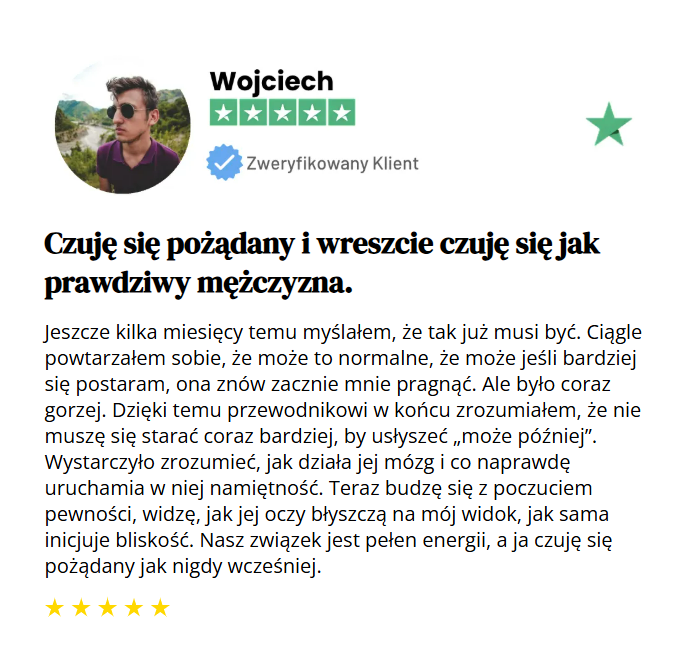 Ponad 74% mężczyzn wybiera tę opcję, bo każda minuta może przybliżyć Cię do tego, by znów czuć jej pożądanie. Chcesz działać szybko? Audiobook da Ci natychmiastowy dostęp do rozwiązań!
