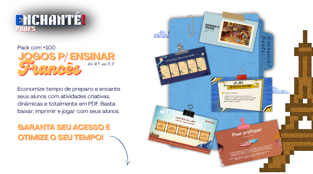 Pack com 30 Atividades de Francês: um conjunto de atividades temáticas, criativas e com design exclusivo, prontas para usar em aula. Os conteúdos vão do nível iniciante ao avançado, seguindo o Quadro Europeu Comum de Referência para Línguas. Você pode imprimir ou enviar o PDF diretamente para o aluno, tornando suas aulas mais dinâmicas e práticas.