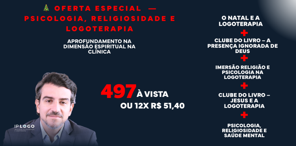 12 meses de acesso aos cursos: Clube do Livro A Presença Ignorada de Deus, Clube do Livro Jesus e a Logoterapia, Psicologia, Religiosidade e Saúde Mental, Imersão Religião e Psicologia na Logoterapia e O Natal e a Logoterapia.