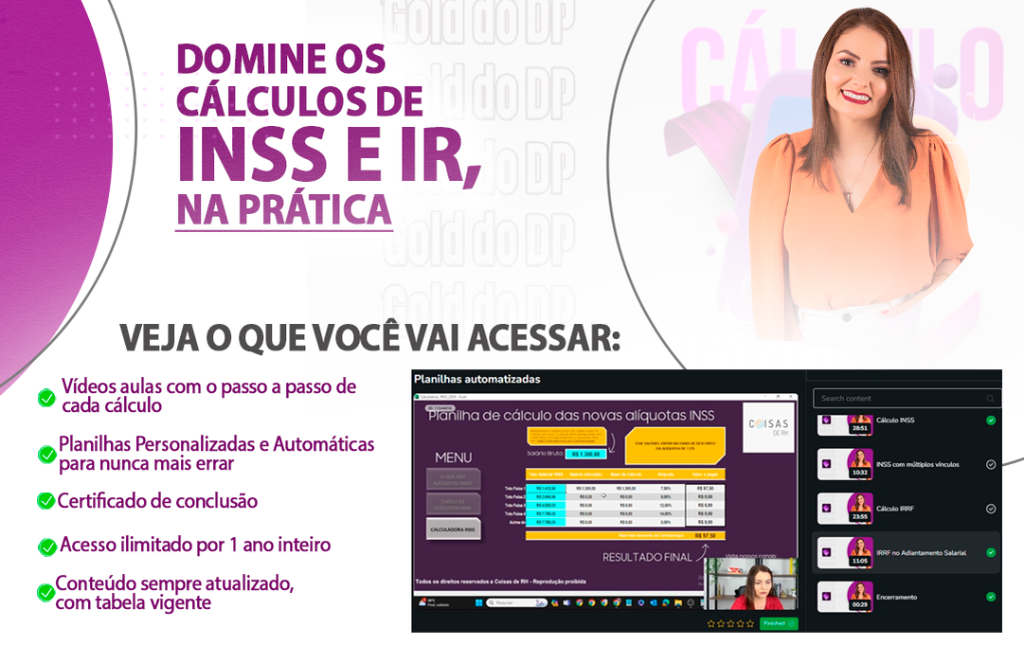 Acesso imediato às vídeos aulas na prática, com o passo a passo dos cálculos de INSS e IR + acesso às PLANILHAS PERSONALIZADAS para nunca mais errar no cálculo ou na conferência