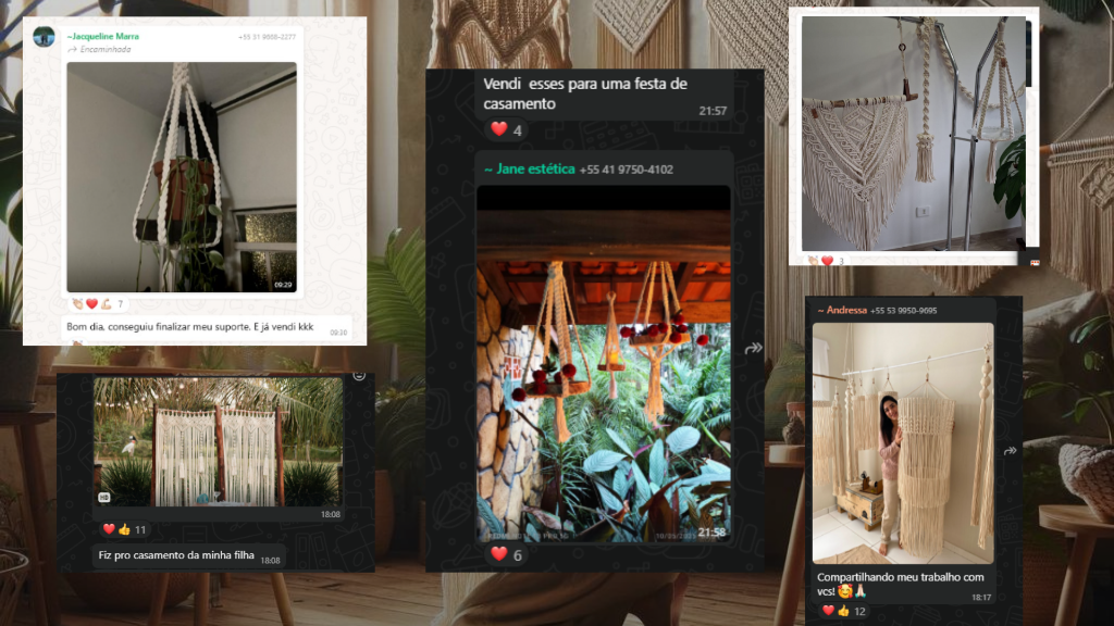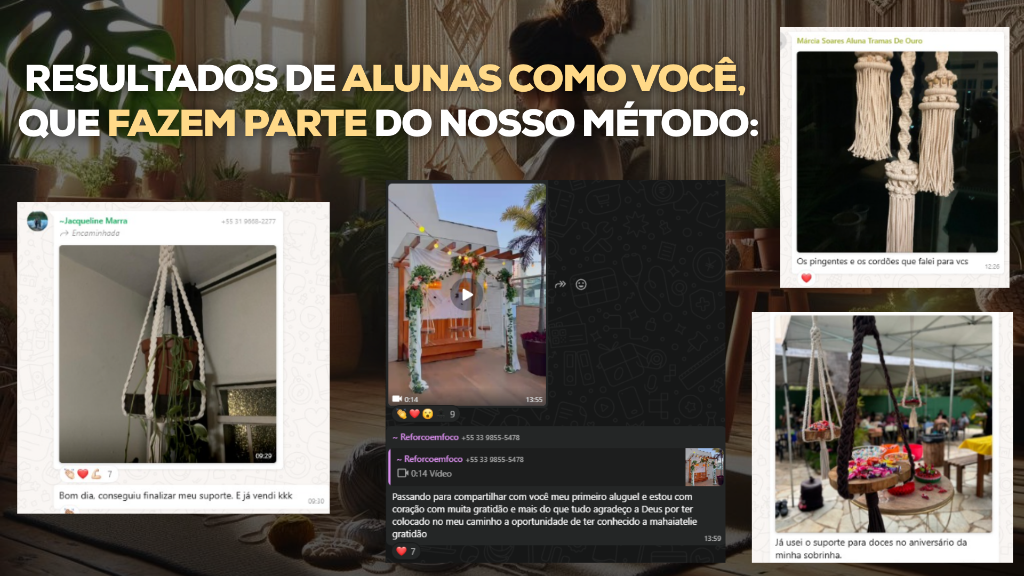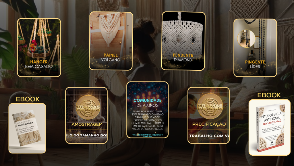 "O curso Tramas de Ouro superou todas as minhas expectativas! Sua didática é excelente, tornando fácil o aprendizado das técnicas de macramê. As peças apresentadas são verdadeiras obras de arte, com um alto valor agregado. Além disso, fiquei impressionada com a variedade de possibilidades para criar novas peças a partir do que foi ensinado. Recomendo o curso para quem deseja se aprofundar nessa técnica e criar peças incríveis. Parabéns, Giovanni e toda equipe, pelo trabalho excepcional!"