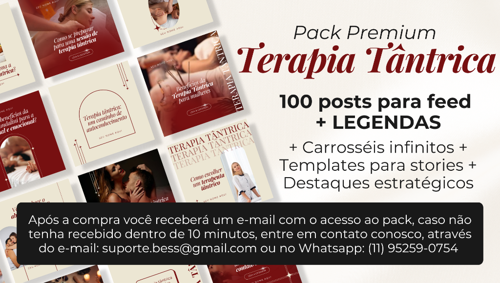 São + de 100 templates profissionais editáveis no Canva gratuito prontos para baixar + LEGENDAS prontas para copiar! Marque a caixa abaixo para acessar agora o Pack Premium Massoterapia, pois essa oferta com DESCONTO exclusivo está disponível somente para essa página!