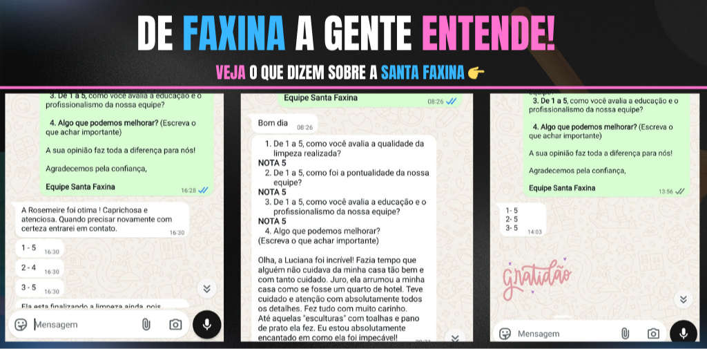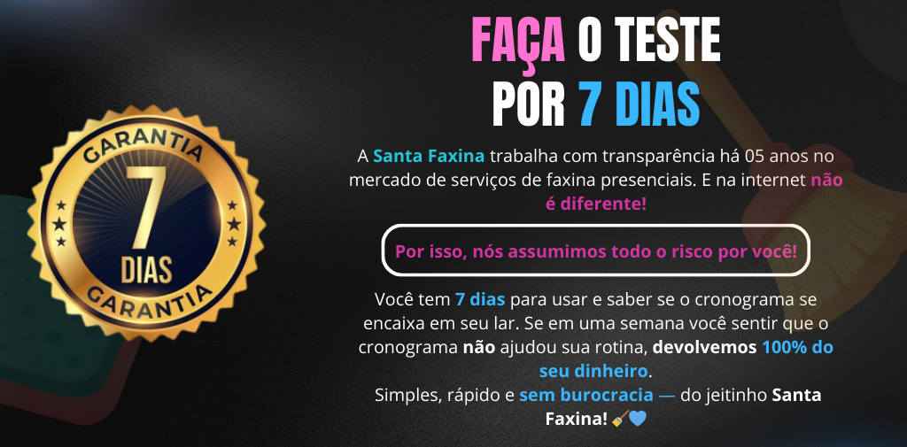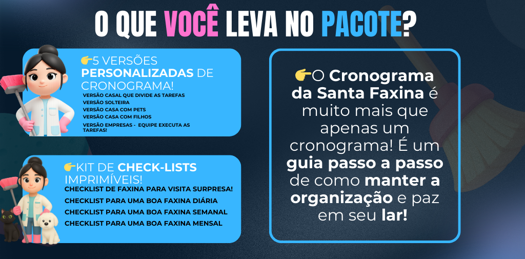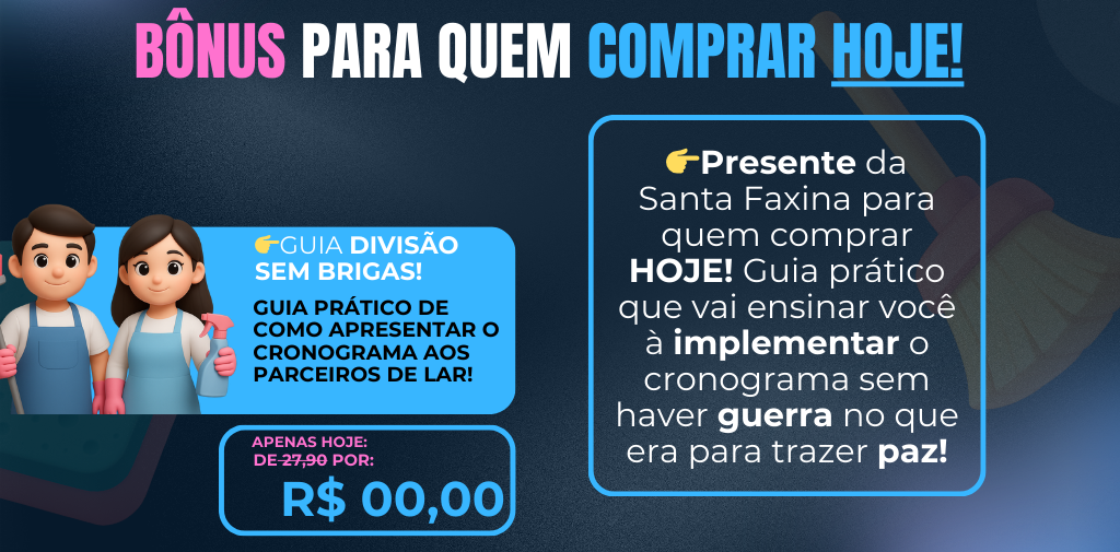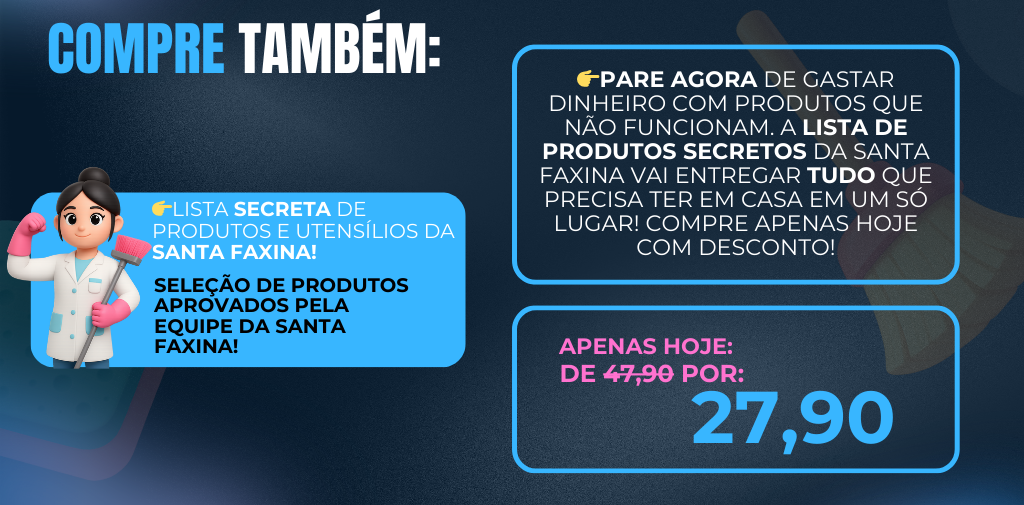 Lista Secreta de Produtos e Utensílios da Santa Faxina! Descubra os itens exatos que usamos em mais de 20 mil atendimentos presenciais para manter qualquer casa impecável. Inclui: ✅ Links oficiais + versões econômicas ✅ Combinações para cada cômodo ✅ Checklist mensal de reposição 👉 Tenha acesso imediato e nunca mais perca tempo escolhendo produtos errados!