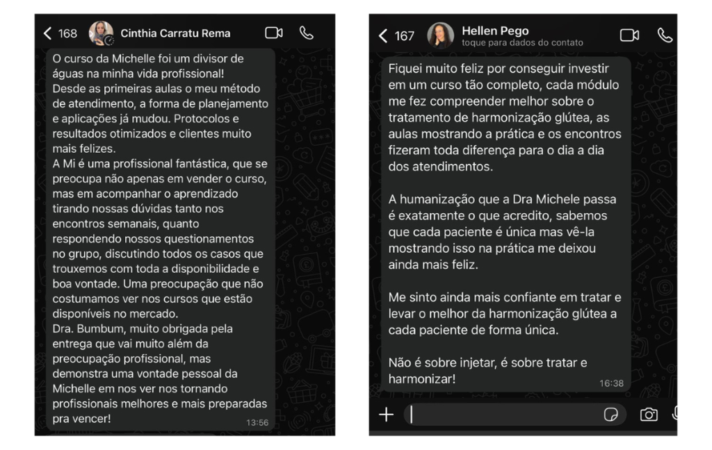 Tenha acesso direto à Dra. Michele via WhatsApp para superar qualquer desafio na Harmonização Glútea com segurança e precisão. Envie fotos e vídeos para suporte em intercorrências, análise detalhada de casos, avaliação estética completa e esclarecimento de dúvidas práticas.