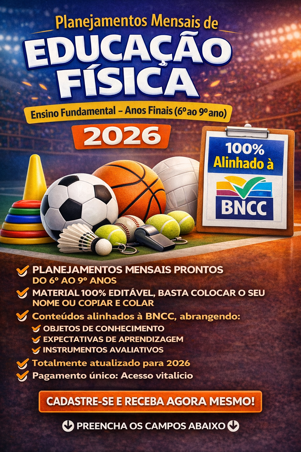 Combo completo com 690 planejamentos diários BNCC, sendo 270 para os Anos Iniciais e 420 de Educação Física para os Anos Finais. Conteúdo 100% alinhado à BNCC, com atividades lúdicas e diversificadas, materiais simples e estrutura pronta para aplicar. Ideal para organizar todo o ano letivo, economizar tempo e garantir aulas criativas, seguras e bem estruturadas.
