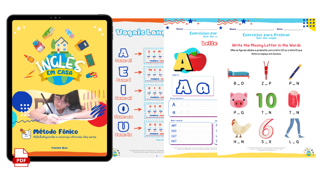 Ensinando Inglês para a criança através do Método Fônico. Sua criança irá aprender os sons das vogais, consoantes e muito mais... Com conteúdo simples e mais de 250 atividades para praticar, com tradução e áudio. Pelo método fônico a criança não precisará apenas decorar, pois ela irá aprender o som de cada letra, e com isso, conseguirá ler e escrever várias palavras, pois conhecerá o som.