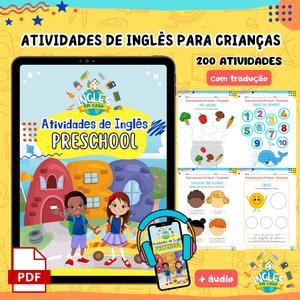 eBook com 250 Atividades de Inglês com tradução, áudio e mais de 25 temas, entre: alfabeto, números, cores, formas geométricas, animais, escola, profissões e muito mais... Indicado para crianças de 4 a 10 anos. E todas as atividades possuem tradução e áudio.