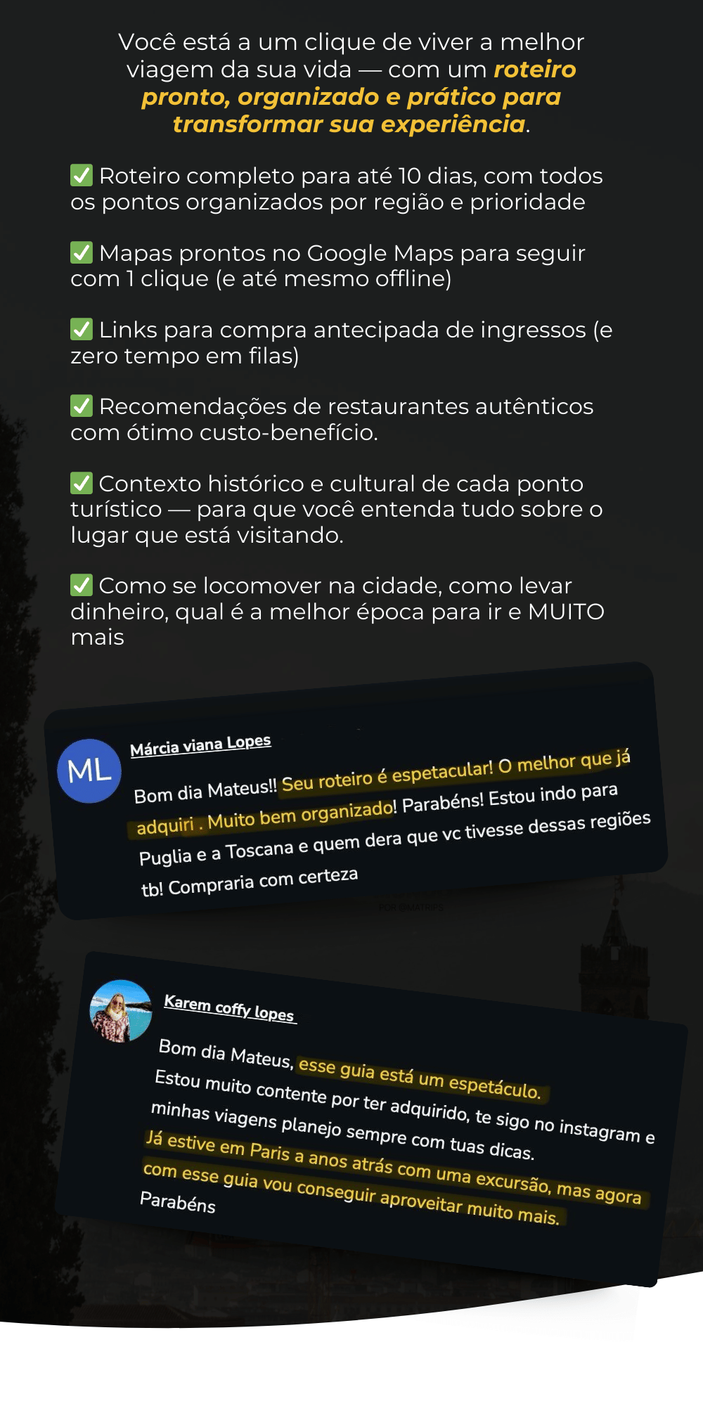 Um Guia com tudo pronto: roteiro dia a dia em Florença e pela Toscana, os melhores restaurantes, paradas imperdíveis, e a história por trás de cada lugar. Pra você só se preocupar em viver ao máximo, sem perder tempo.