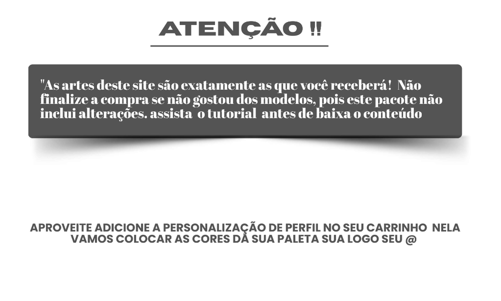 Ao adquirir este produto, eu personalizo seu pack com a sua paleta de cores, sua logo ou @ do Instagram, deixando tudo prontinho pra você baixar e usar direto no feed. ATENÇÃO Após a compra, é necessário enviar sua logo ou @ do Instagram e paleta de cores para que a personalização seja feita com a sua identidade visual. Prazo de entrega: Seu pack será entregue em até 48 horas após o envio da logo/@ e paleta de cores. Ideal para empreendedores que buscam praticidade e uma identidade