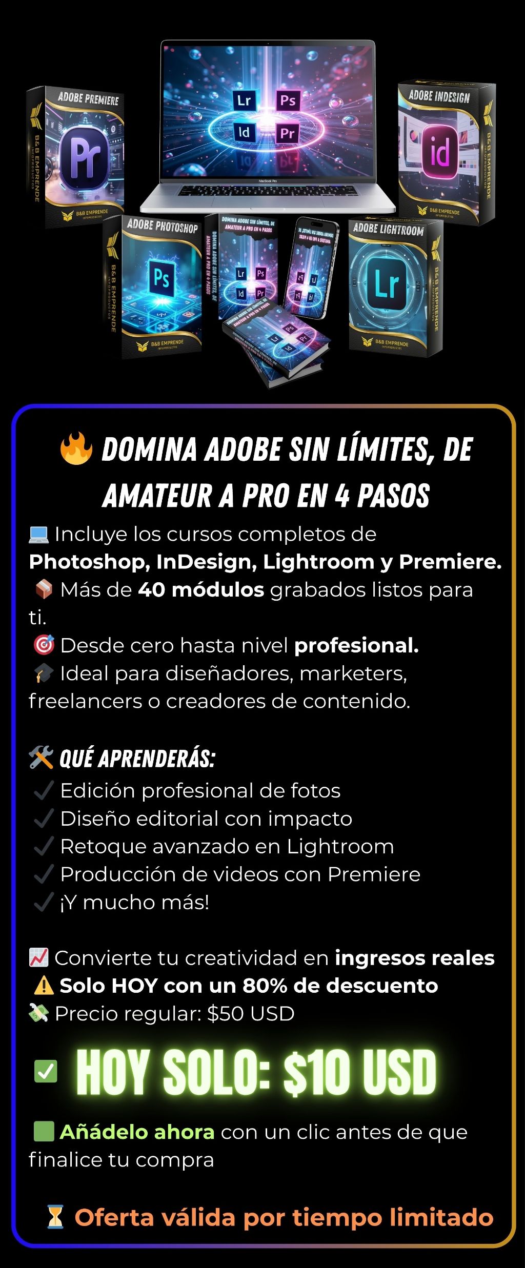🎨 Curso Adobe Completo – 80% OFF SOLO HOY. Accede a los cursos completos de Photoshop, Lightroom, Premiere e InDesign y aprende desde cero a diseñar como un profesional. 💥 Esta oferta única incluye una orientación secreta y exclusiva que te enseñará cómo monetizar tus habilidades y generar ingresos reales. Solo hoy a este precio irrepetible. Nadie más te dará tanto por tan poco. ¡Haz clic ahora y no dejes escapar esta oportunidad de transformar tu creatividad en dinero!