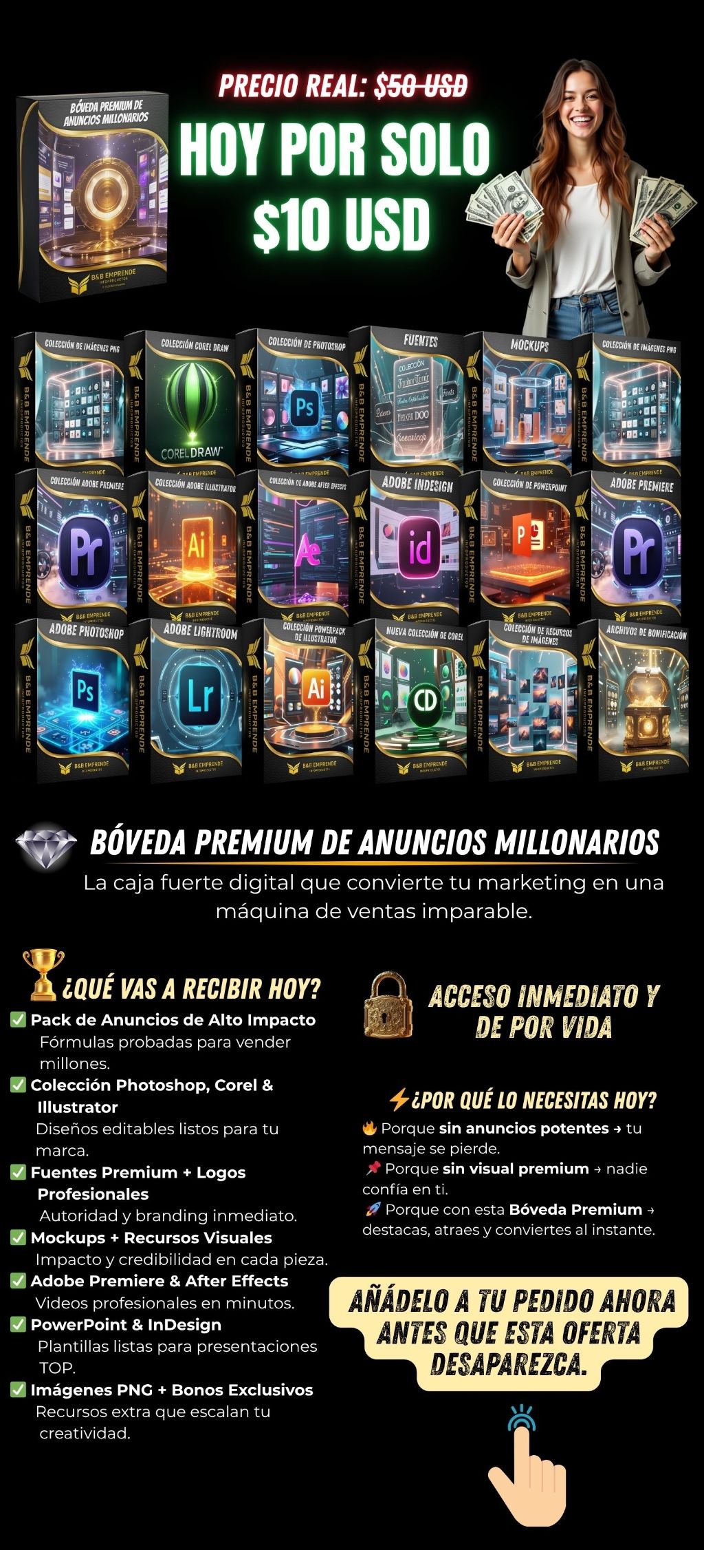 De Invisible a Irresistible: La Bóveda Premium de Anuncios que Venden Millones ¿Sientes que tu negocio sigue siendo invisible, perdido en el ruido digital, mientras tus ventas no reflejan el esfuerzo que inviertes? Sabes que tu producto es valioso… pero si nadie lo ve, nadie lo compra. Eso frustra, estanca y duele. Por eso nace la Bóveda Premium de Anuncios Millonarios: un sistema completo para transformar tu marketing en una máquina de ventas imparable. No es otro curso más. Es tu nueva venta