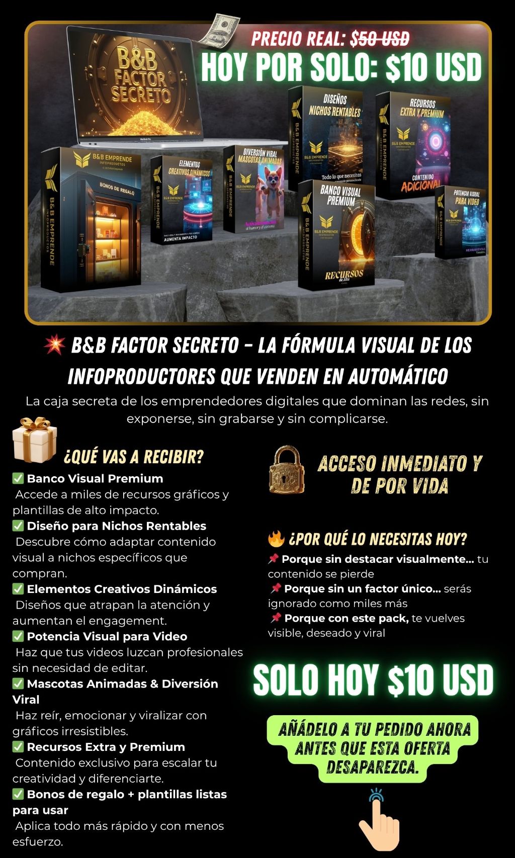 ¿Tu contenido se ve común, pero sueñas con vender como los grandes? B&B FACTOR SECRETO te da el nivel visual de los infoproductores millonarios: diseño, percepción y estrategia que impacta y convierte. 💥 Es tu ventaja oculta para vender más, incluso si tienes menos experiencia. Pero atención: esta oportunidad única no volverá a repetirse. Si la dejas pasar, será para siempre. ¡Haz clic ahora y entra al círculo de los que venden con poder visual!