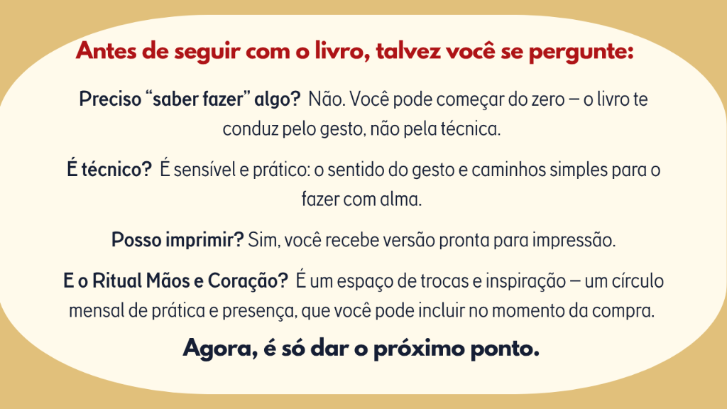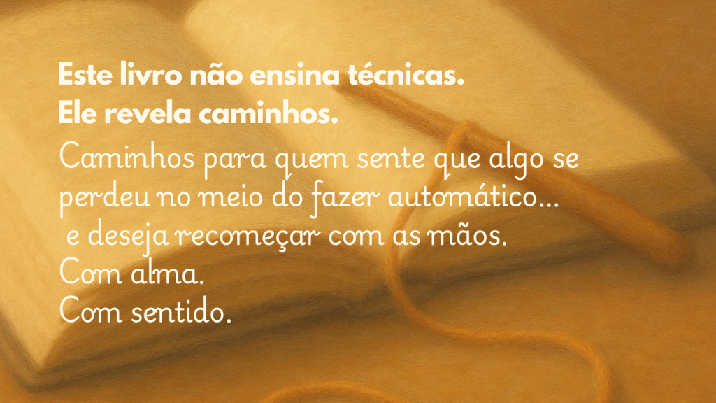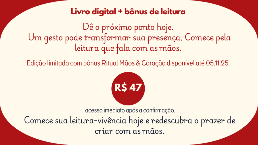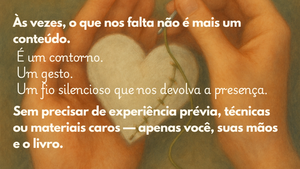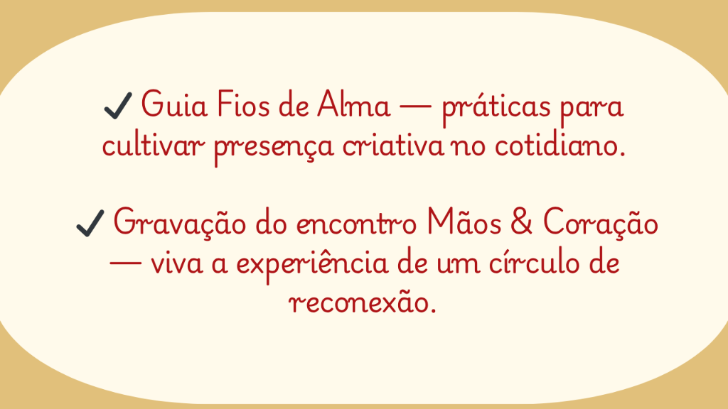 Com as mãos e com o coração nasce como um espaço mensal de prática e partilha. Um encontro terapêutico onde os fios se tornam caminhos de calma, presença e reconexão. Cada encontro é uma pausa intencional na rotina, um convite para silenciar a mente e costurar aconchego no corpo e na alma.