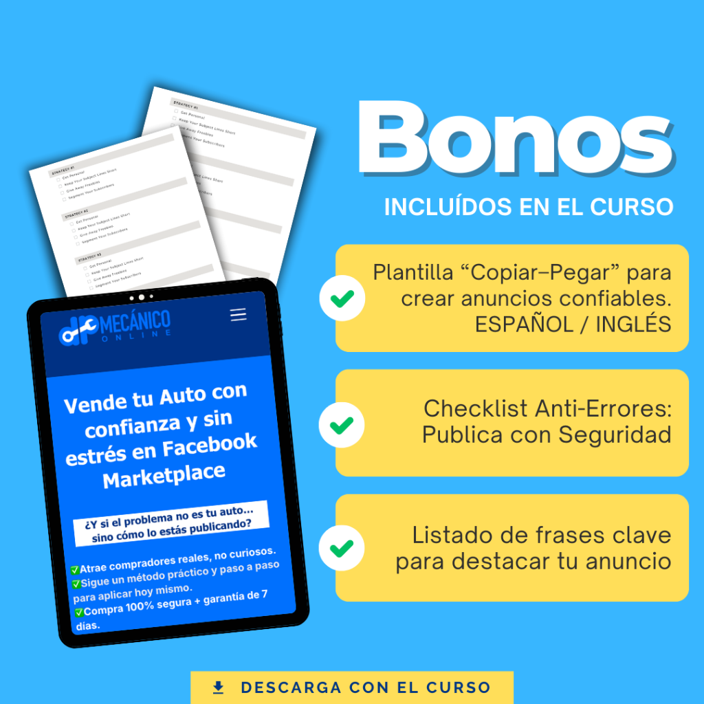 💡 Si estás vendiendo tu auto para comprar uno mejor, este curso también te acompaña en el proceso de analizar anuncios y revisar un vehículo desde cero, para que tu compra sea segura y sin sorpresas. 🚗 Todo guiado por un técnico automotriz certificado con más de 6 años de experiencia que garantiza total confianza.
