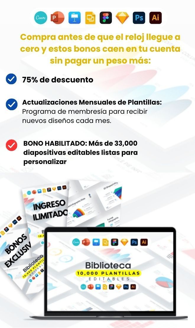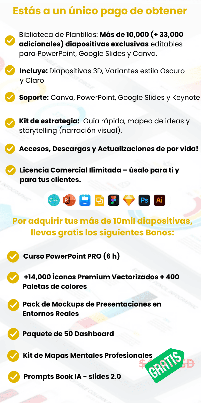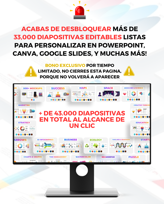 Complementa y Accede a 137,000 diapositivas de POWERPOINT diseñadas para todas tus necesidades de presentación. Este paquete único de plantillas premium te ofrece opciones profesionales y personalizables para cualquier proyecto, ya sea empresarial, educativo o personal.