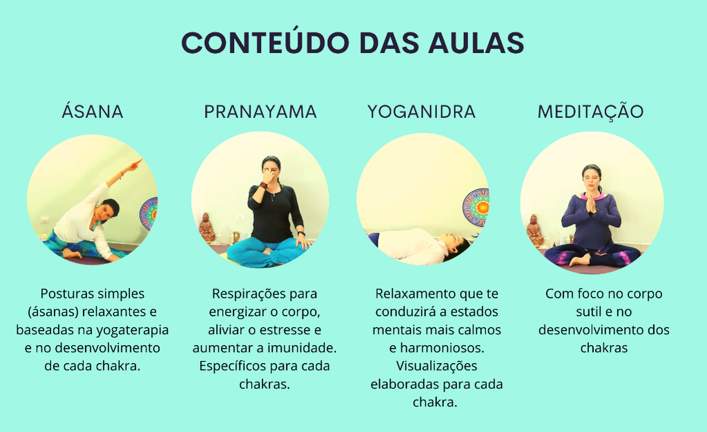 As aulas são elaboradas com posturas focadas em ativar cada chakra, um por semana. As técnicas de respiração também foram escolhidas para potencializar as energias de cada chakra, aliviar o estresse e aumentar a saúde. O relaxamento guiado traz visualizações especificas para desenvolver as qualidades de cada centro sutil e te conduzir a estados mentais mais calmos e harmoniosos. A meditação é guiada em cada chakra, para te auxiliar a entrar em contato com a essência divina do seu coração, liberando o medo, as tensões e fortalecendo sua conexão espiritual.