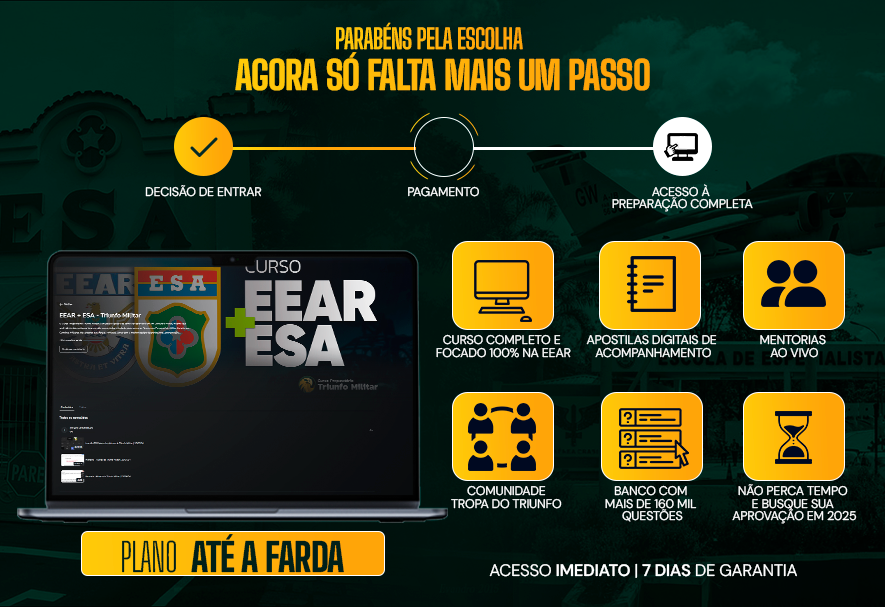 Você terá acesso ao pacote EEAR+ESA até atingir o limite de idade do concurso. Não precisará se preocupar mais com renovações de materiais, focando apenas nos estudos.