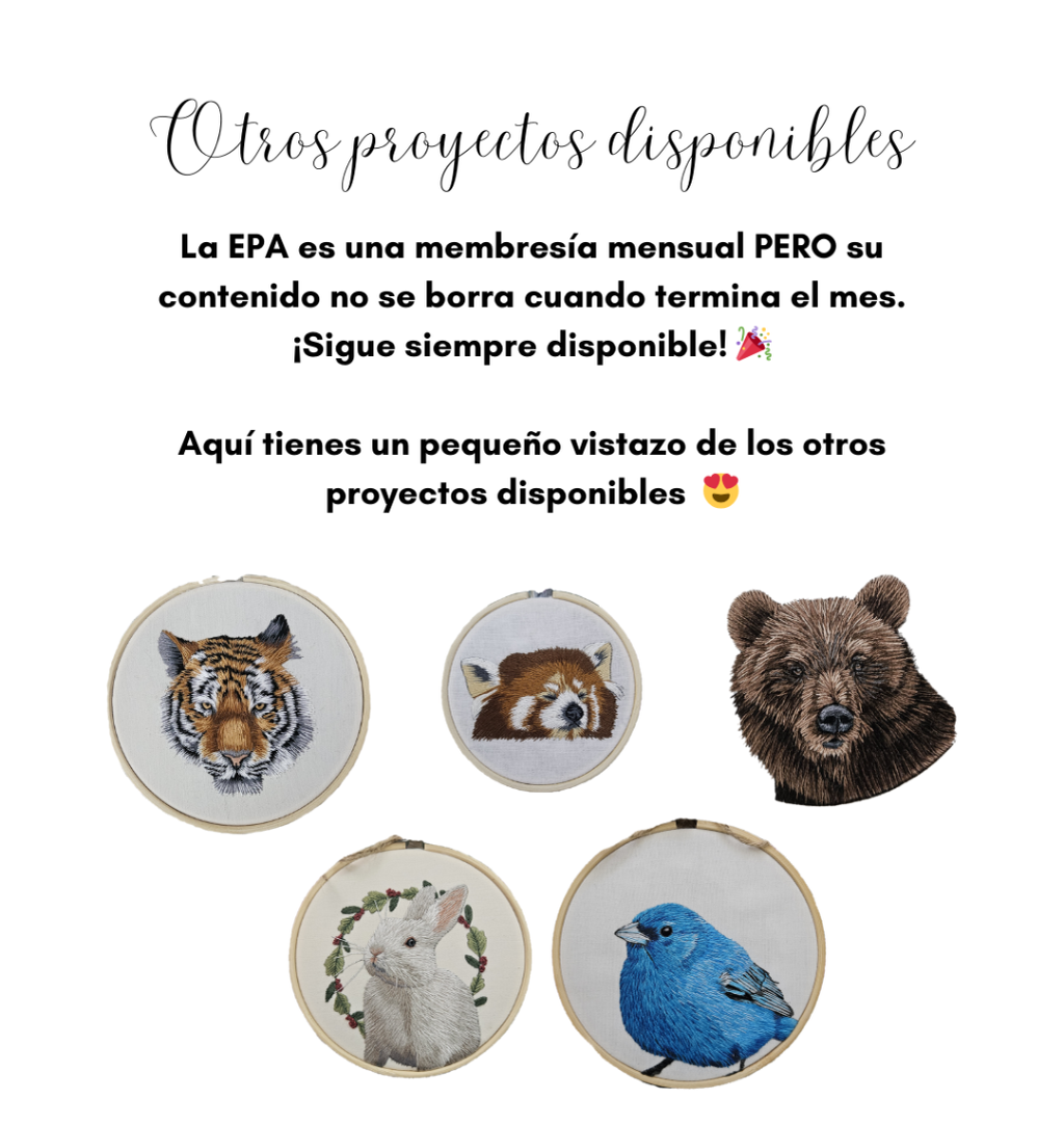 La EPA es una Es una membresía mensual y online (tu Netflix del bordado realista) donde aprenderás todo sobre la técnica del bordado realista, también conocido como "pintura a la aguja".