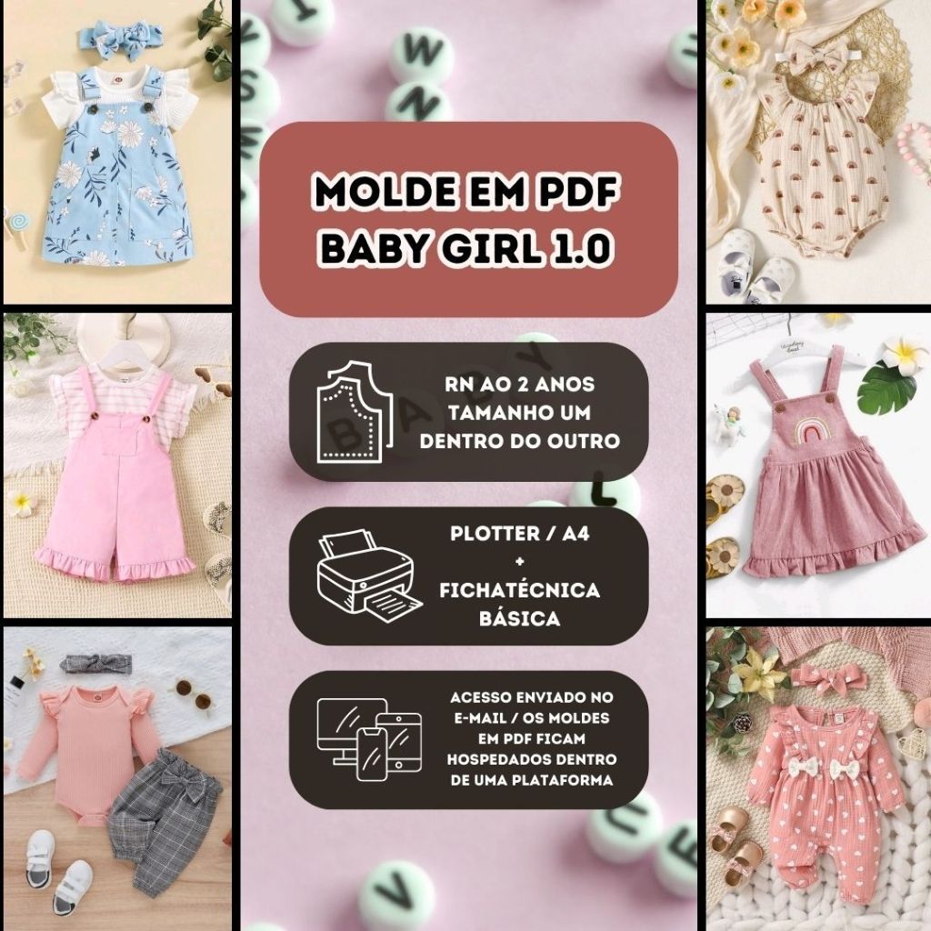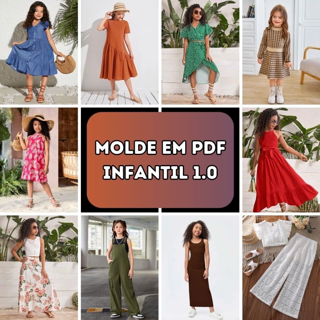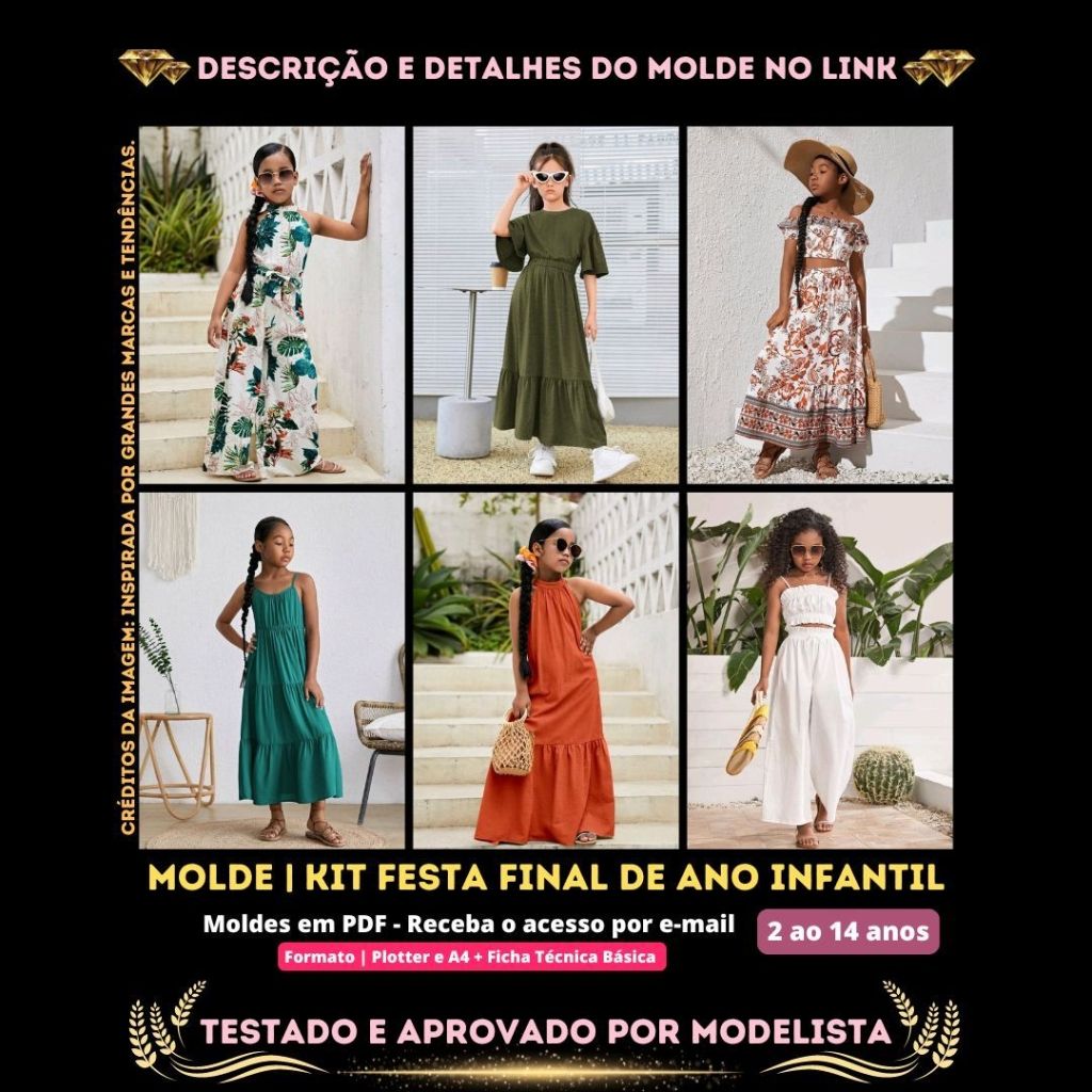 Molde em PDF - Kit Festa Final de Ano Infantil (1 Macacão, 2 Conjuntos e 3 Vestidos)
