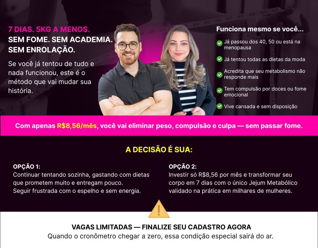 Perfeito para quem não tem tempo, mas quer energia, leveza e resultados visíveis já nos primeiros dias. ✅ Refeições e shakes prontos em até 5 minutos ✅ Ingredientes simples e baratos que aceleram seu metabolismo ✅ Receitas desenhadas para desinchar e reduzir a barriga rapidamente ✅ Energia e disposição sem complicação — até na rotina mais corrida