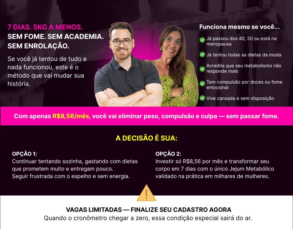 Perfeito para quem não tem tempo, mas quer energia, leveza e resultados visíveis já nos primeiros dias. ✅ Refeições e shakes prontos em até 5 minutos ✅ Ingredientes simples e baratos que aceleram seu metabolismo ✅ Receitas desenhadas para desinchar e reduzir a barriga rapidamente ✅ Energia e disposição sem complicação — até na rotina mais corrida