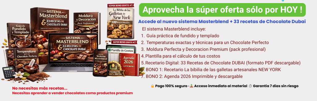 ✨ Agrega el toque WOW a tus chocolates No te quedes solo con las recetas. Haz que cada bocado sorprenda con rellenos irresistibles, salsas cremosas y toppings crocantes inspirados en la repostería de lujo árabe. Incluye: *12 combinaciones exclusivas con ingredientes y pasos claros. *Alternativas accesibles para que siempre tengas opciones a mano.