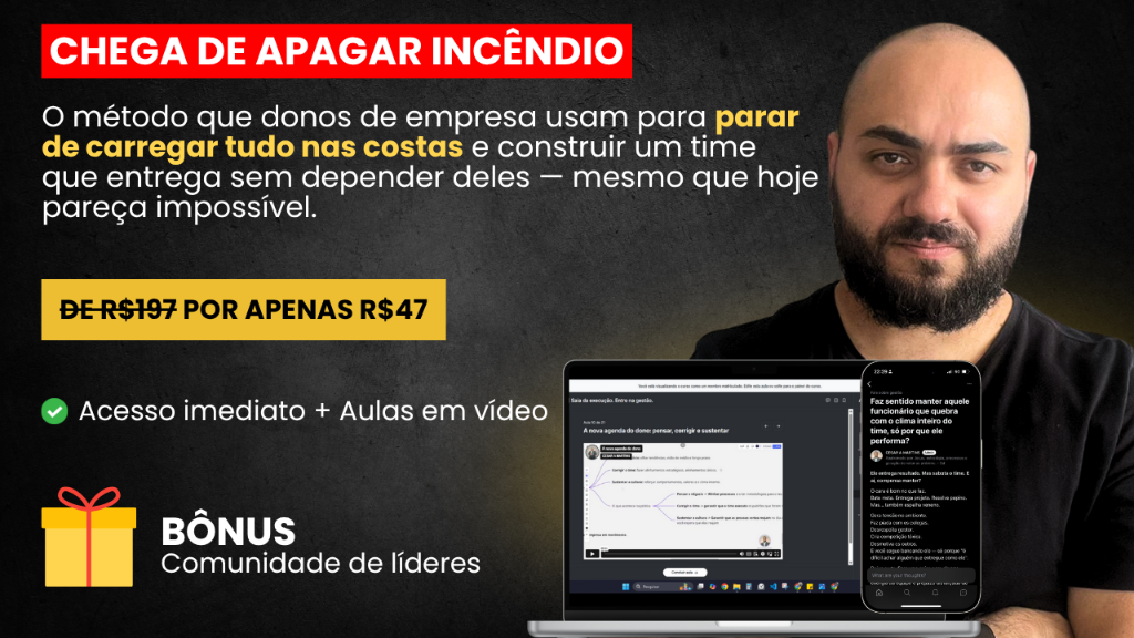 Metodologia prática para estruturar sua empresa com times que funcionam sem você. Aprenda a delegar com clareza, criar processos simples e sair do caos operacional. Ideal para quem cansou de carregar tudo nas costas.